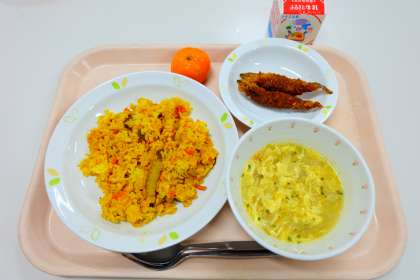 9月28日(火)の給食 公開日 2021/09/28 更新日 2021/09/28 給食 《今日の献立》 ・メキシカンライス ・ししゃものごまフライ ・トマトとたまごのスープ ・冷凍みかん ・牛乳 いいね(0) 給食