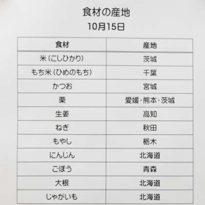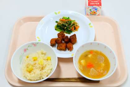 《今日の献立》 ・栗おこわ ・かつおの香味揚げ ・野菜のごまあえ ・田舎汁 ・牛乳