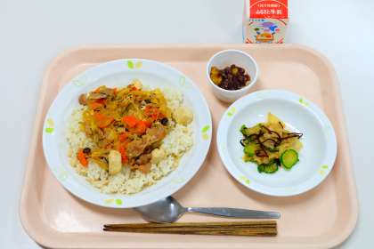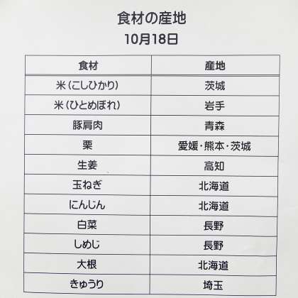 《今日の献立》 ・豚すき丼 ・大根の塩こんぶあえ ・栗入り小倉白玉 ・牛乳