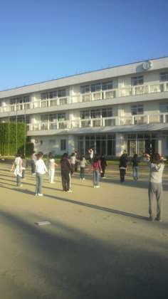 朝礼です。今日も一日元気に過ごせるようにラジオ体操から始まります。みんなとても元気そうです。