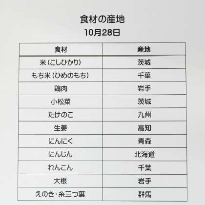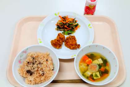 10月28日(木)の給食 公開日 2021/10/28 更新日 2021/10/28 給食 《今日の献立》 ・赤飯 ・鶏肉のからあげ ・根菜ののりサラダ ・世田谷中すまし汁 ・ジョア いいね(0) 給食