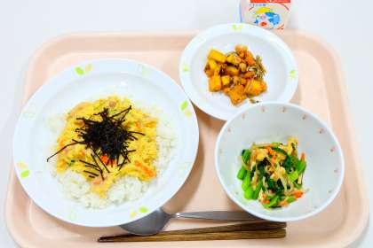 11月22日(月)の給食 公開日 2021/11/22 更新日 2021/11/22 給食 《今日の献立》 ・親子丼 ・油揚げと野菜の酢みそあえ ・大豆と煮干しのカリポリ揚げ ・牛乳 いいね(0) 給食