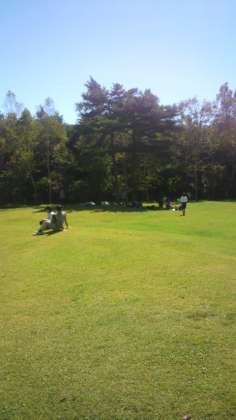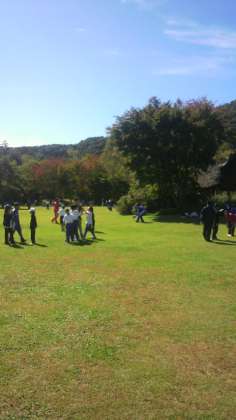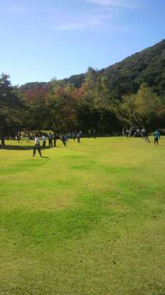 広い芝生の広場でみんな楽しそうに遊んでいます。