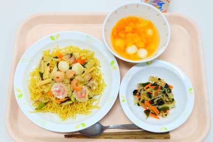 ≪今日の献立≫ ・五目あんかけやきそば ・大根とわかめのサラダ ・フルーツ白玉 ・牛乳