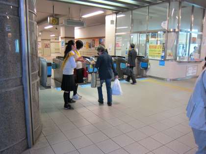 ボランティア生徒12名が、1500個のティッシュを配りながら協力のお願いをしました。