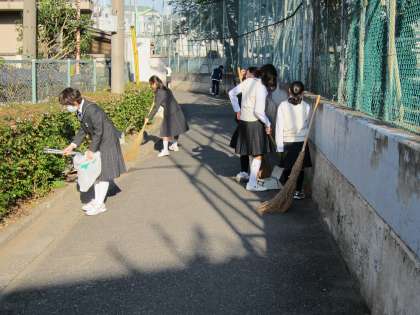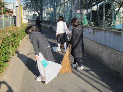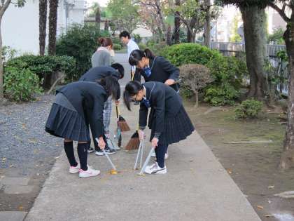 冷え込んだ朝、木枯らしによって出たごみを、1年生のボランティア生徒がきれいに掃き掃除をしてくれました。
