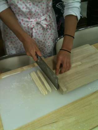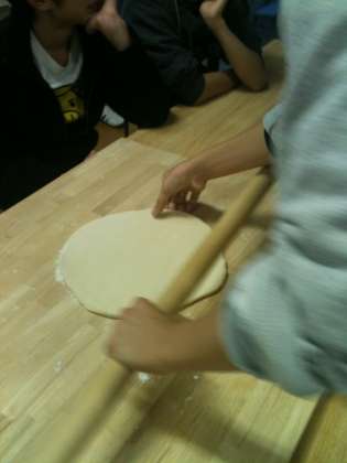 今日の夕ご飯は手作りうどんです。みんな一生懸命作っています。あっ、ほうとうになってしまった班もいるみたいです。