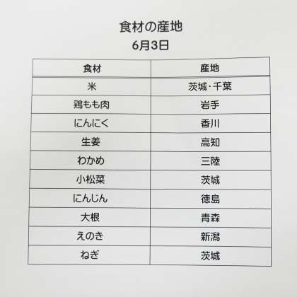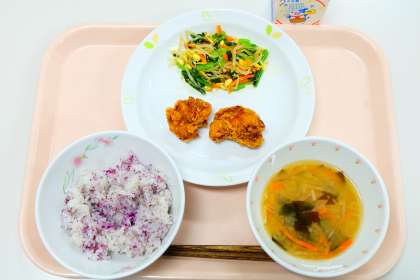 《今日の献立》 ・ゆかりごはん ・鶏肉のからあげ ・塩ナムル ・大根のみそ汁 ・牛乳