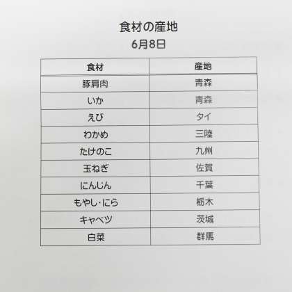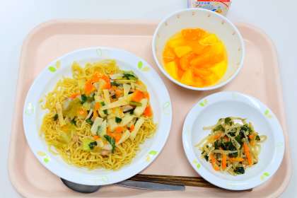 《今日の献立》 ・五目あんかけやきそば ・わかめサラダ ・フルーツポンチ ・牛乳