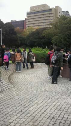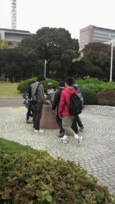 事後学習のために、赤い靴はいた女の子の像に、みんなで群がっています。