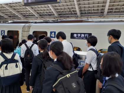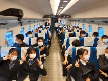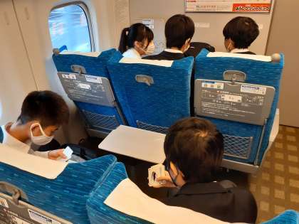 専用列車に乗って、新大阪に向かって出発です。早速、車内は楽しい雰囲気でいっぱいです。