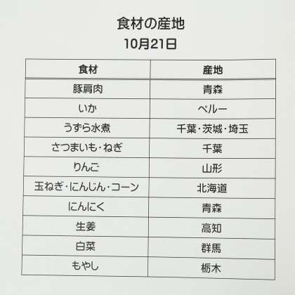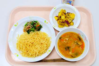 《今日の献立》 ・みそラーメン ・ナムル ・りんご入り大学芋 ・牛乳