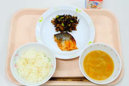 11月4日(金)の給食 公開日 2022/11/04 更新日 2022/11/04 給食 《今日の献立》 ・ごはん(こしひかり・ひとめぼれ) ・さばの七味焼き ・ひじきの彩り煮 ・キャベツと油揚げのみそ汁 ・牛乳 いいね(0) 給食