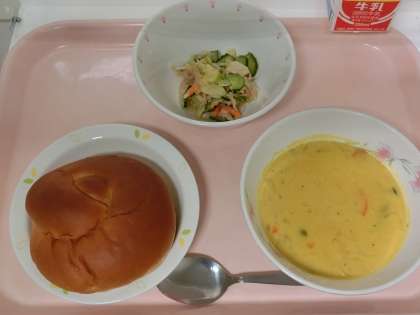 ≪今日の給食≫ 黒砂糖パン かぼちゃのシチュー ツナサラダ 牛乳