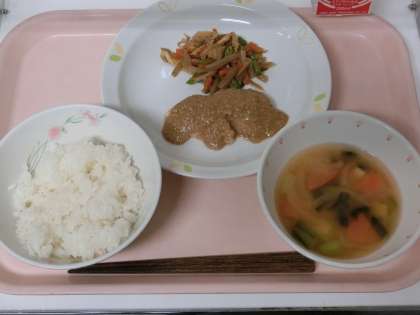 《今日の給食》 ごはん さわらのごまだれかけ 五目きんぴら みそ汁 牛乳