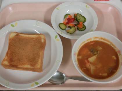《今日の給食》 きなこバタートースト トマトチキンシチュー ピクルス 牛乳