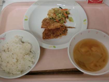 《今日の給食》 ごはん あじフライ 野菜のからしあえ 豆腐となめこのみそ汁 牛乳