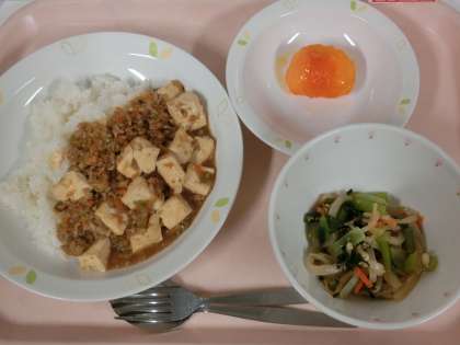 ≪今日の給食≫ ごはん 麻婆豆腐 こんにゃくサラダ 柿 牛乳