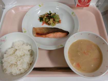 ≪今日の給食≫ 有機米ごはん 鮭の西京焼き 野菜とちくわのおひたし 粕汁 牛乳