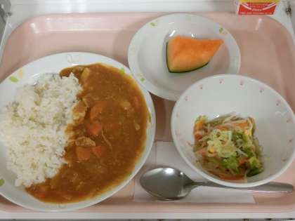 ≪今日の給食≫ ポークカレーライス 新玉ねぎドレッシングのサラダ メロン 牛乳