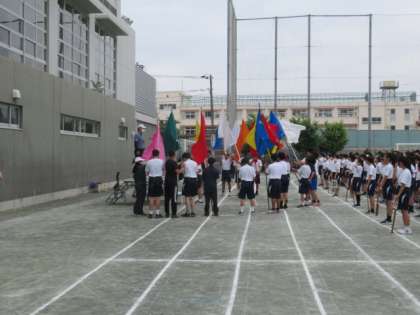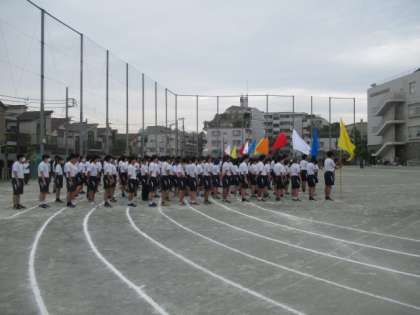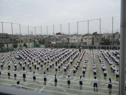 雨雲が近づいてきましたが、1時間目に全体練習ができました。開会式とラジオ体操の練習をしました。