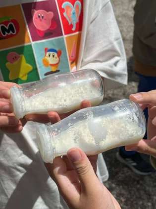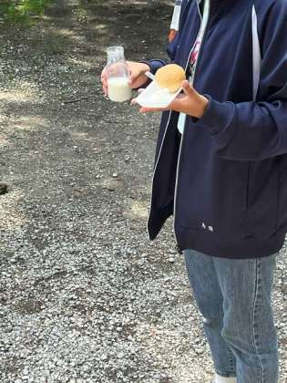 搾乳体験の後はバター作りです。ビンに入った新鮮なミルクを一生懸命振ってバターにしました。パンにつけた、できたてのバターの味は絶品でした。