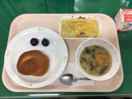 《今日の給食》 黒砂糖パン マカロニグラタン レンズ豆の野菜スープ 巨峰 牛乳