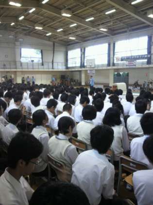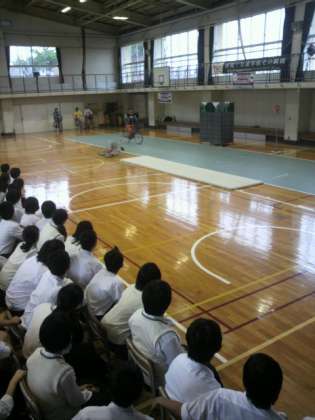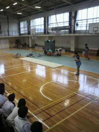 本日は、セーフティ教室を実施しています。雨が降ってしまったので、体育館での実施となりました。主に自転車の正しい安全な乗りかたについて、スタントチームの実演を見ながら学習します。