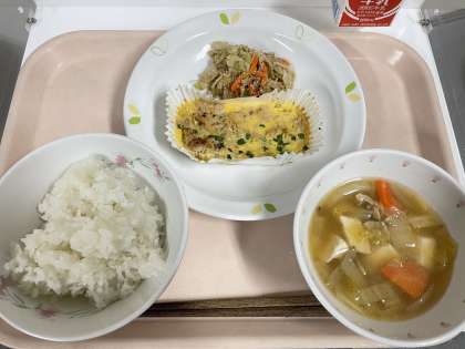 《今日の給食》 ごはん 切干大根のたまご焼き 野菜のごま酢かけ 根菜汁 牛乳