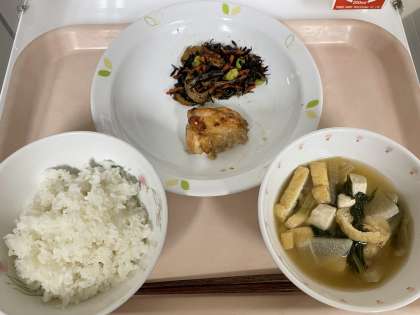 《今日の給食》 有機米ごはん 鶏肉の香味焼き ひじきの彩り煮 みそ汁 牛乳