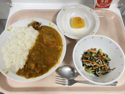 《今日の給食》 ポークカレーライス 福神漬 ひじき入りナムル 柿 牛乳