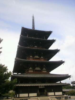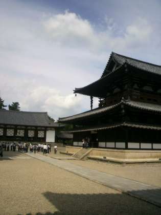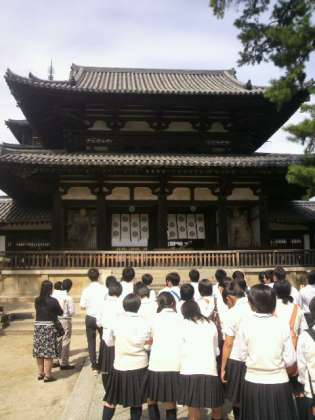 法隆寺に到着しました。修学旅行生でいっぱいですが、みんなで世界遺産の素晴らしさを、直接感じています。