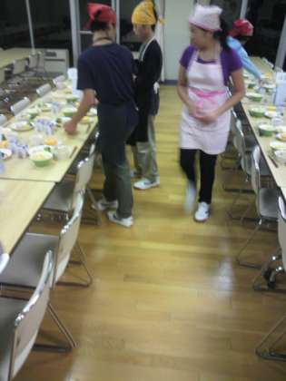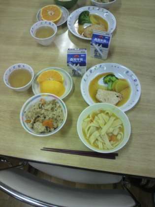 食事係が、夕食の準備をしています。本日のメニューは、魚の煮付け、五目ごはん、ほうとう、オレンジ、漬け物、牛乳、お茶 です。かなりお腹がへりました。とても美味しそうです。