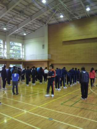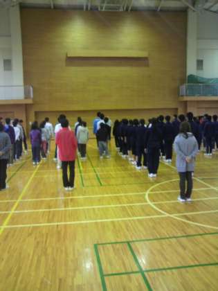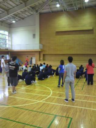 おはようございます。2日目の朝です。少し雨が降っているので、体育館で朝礼を行っています。具合の悪い人はいません。みんな元気です。今日も1日頑張りましょう。