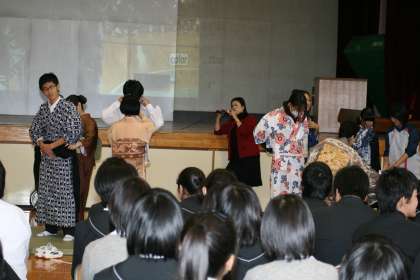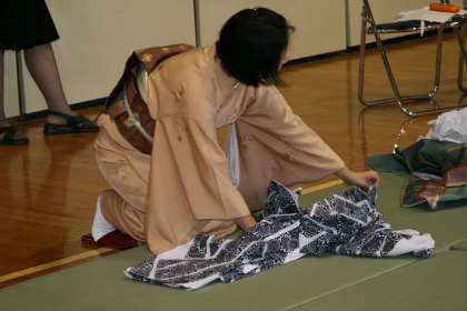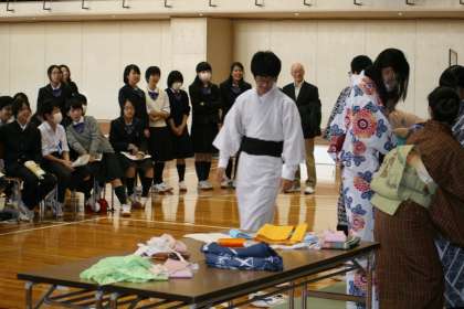 3年生は、日本文化領域の授業で、着物の着付け学習がありました。