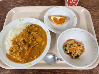 《今日の給食》 ハッシュドポークライス 大根サラダ 天草オレンジ 牛乳