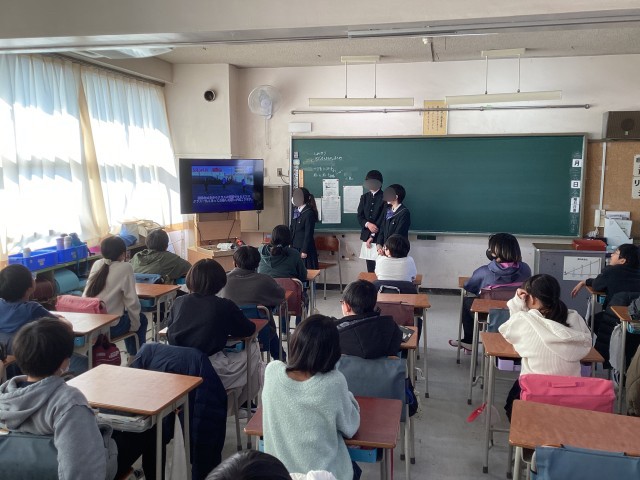 日本語の授業で作成した「世田谷中の紹介CM」を披露するため、山崎小学校の6年生の教室を代表生徒が訪れました。本校生徒が作成したCMは6年生に好評でした。城山小と若林小には来週訪問します。