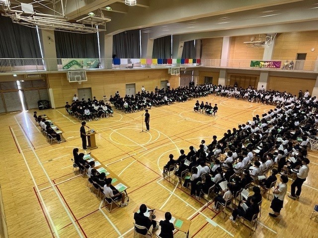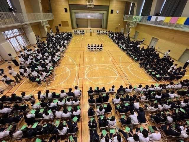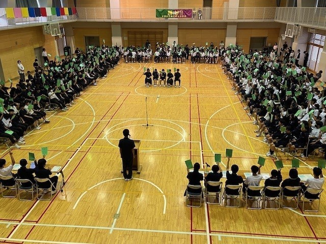 生徒総会が開かれました。生徒会と議長団を中心に会が整然と進められ、質疑する生徒も答弁する委員長も全生徒の目の前という緊張感の中、立派に役割を果たしていました。決議は手持ちのグリーンの議案書を掲げて生徒の過半数を確認しました。