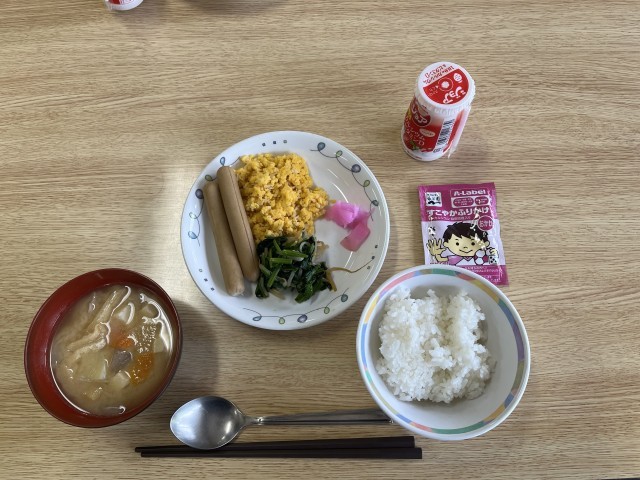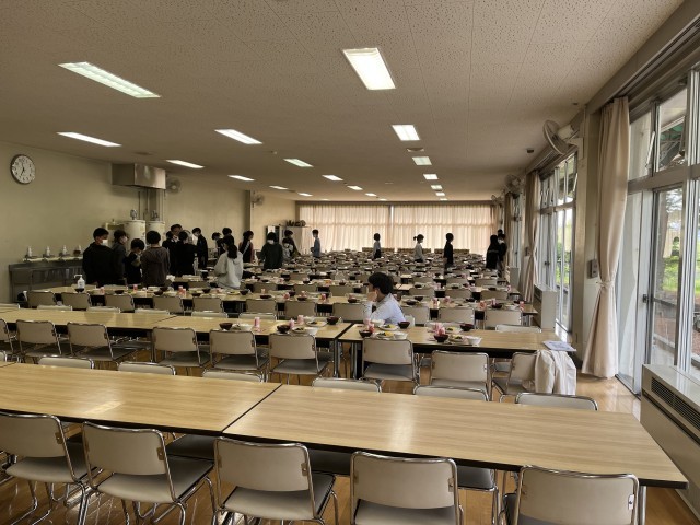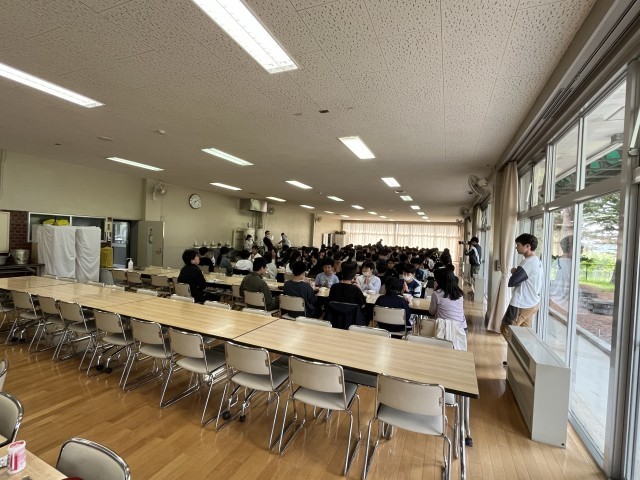 2日目の朝食準備、メニュー、食事係のいただきますのあいさつをしているところです。メニューのセットの写真はご飯と汁物の位置が逆です。すみません。