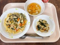 《今日の給食》五目あんかけやきそばわかめサラダフルーツ白玉牛乳