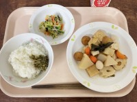 《今日の給食》ごはん大根葉のそぼろあん大蔵大根のおでん小松菜のからしあえ牛乳