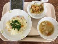 《今日の給食》たまごチャーハン白身魚のチリソース春雨と青菜のスープ牛乳