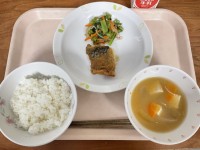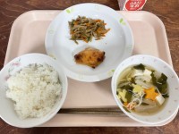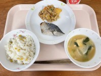 《今日の給食》とうもろこしごはんさわらの塩麹焼きじゃがいものそぼろ煮みそ汁牛乳