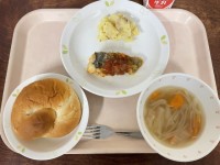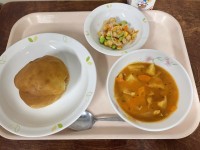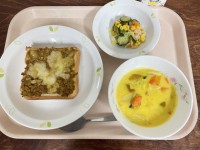 《今日の給食》ドライカレートーストきゃべつサラダかぼちゃのシチュー牛乳
