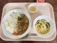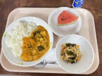 《今日の給食》夏野菜のチキンカレーライス大根とわかめのサラダ小玉すいかジョア