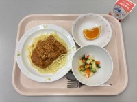 【4月20日の給食】*ミートソーススパゲティ*マセドアンサラダ*果物(清見)*牛乳