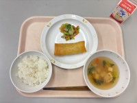 【4月21日の給食】*ご飯*手作り春巻き*野菜のおかか和え*豆腐と小松菜のすまし汁*牛乳
