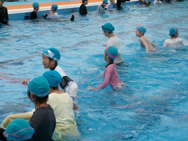 着衣泳では、上下の服を着て、靴を履いてプールに入りました。水の中では、体が重くて