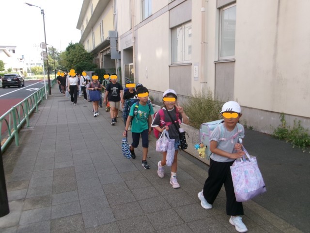 今日は、集団登校で、列になって子どもたちが登校して来ました。