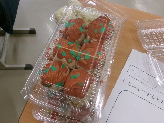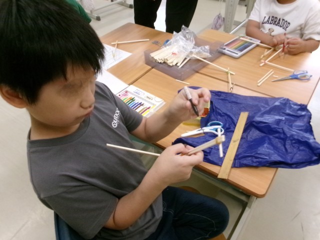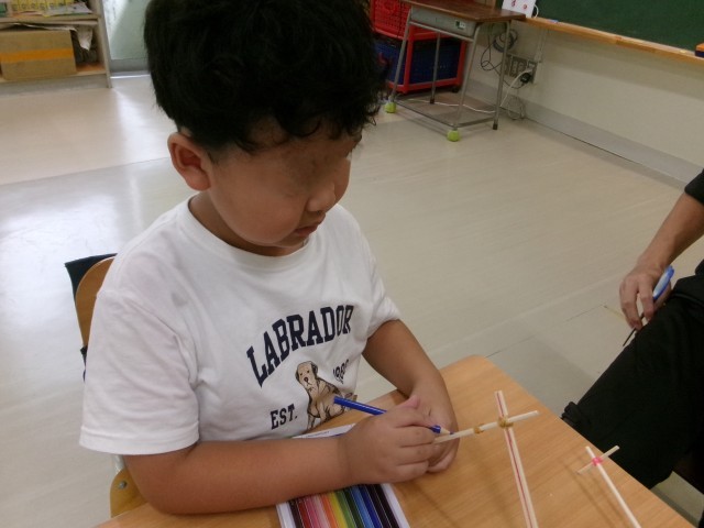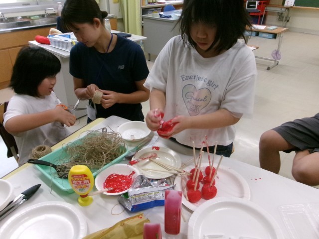 たこ焼きやりんご飴、輪ゴム鉄砲など「縁日」で遊べるものを作っていました。色紙を丸めたり、紙ねんどを使ったりして、リアルなたこ焼きやりんご飴を作りました。りんご飴作りでは、赤い絵の具を入れた紙ねんどを手を汚しながら一生懸命にこねていました。「縁日」が来るが楽しみです。